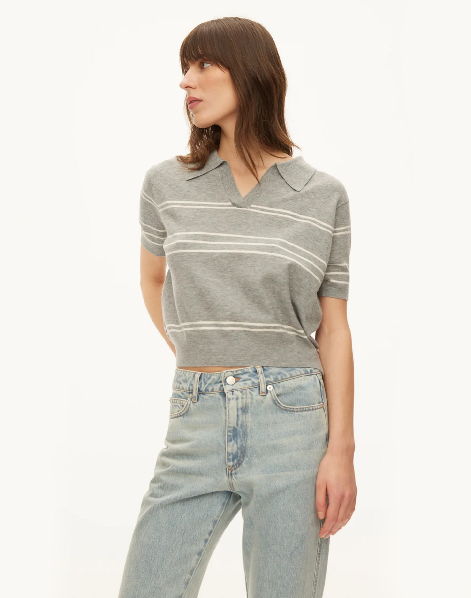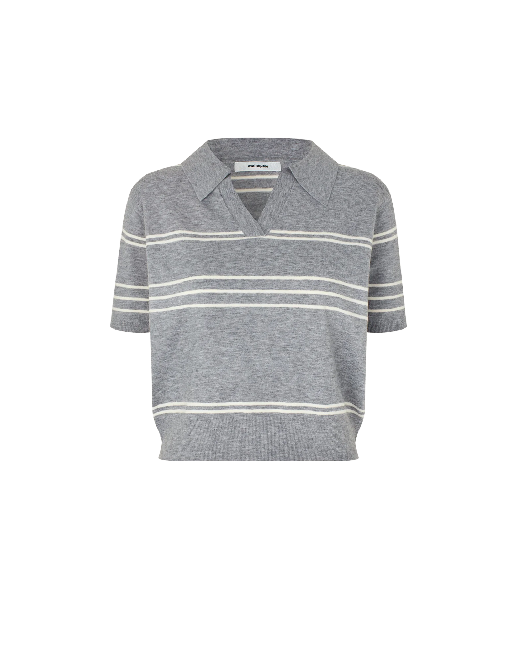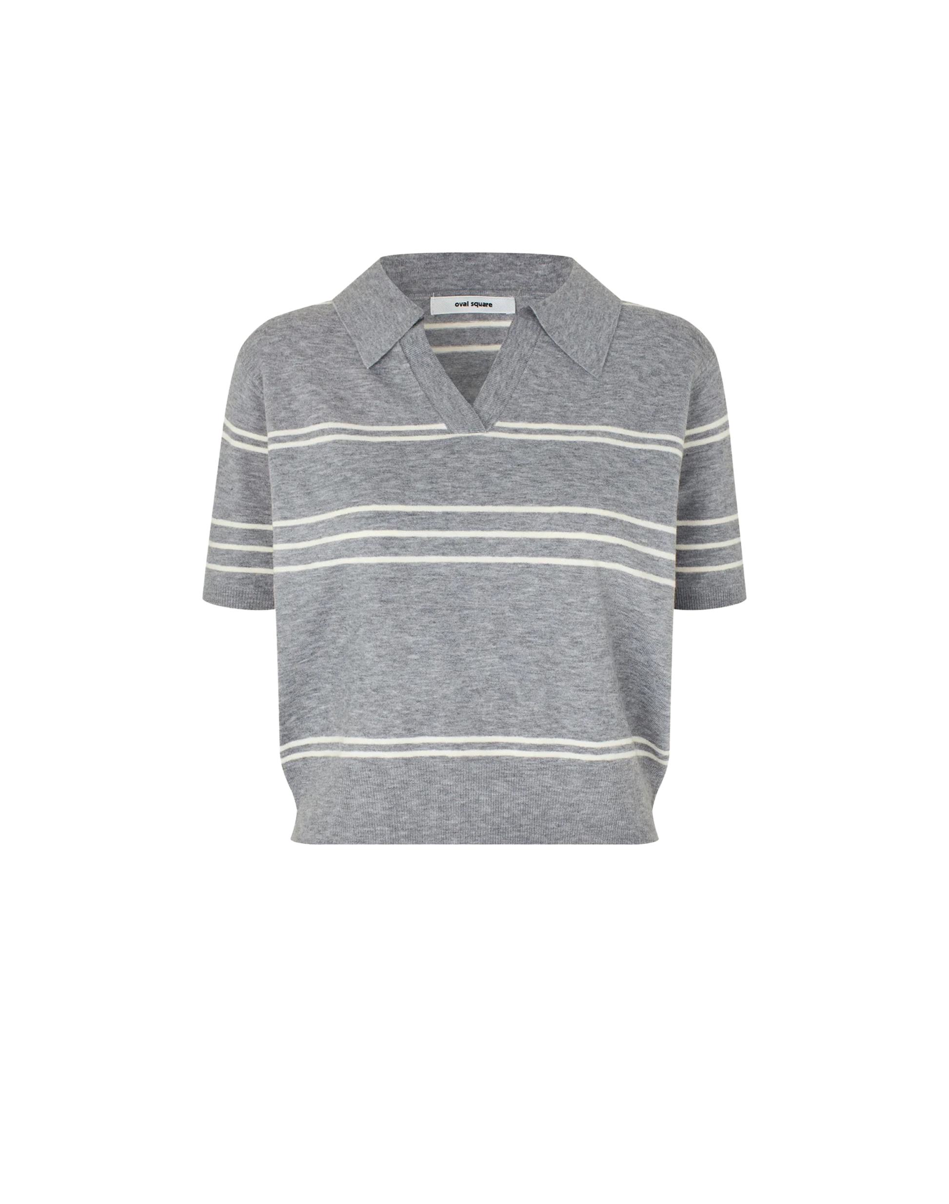 Kurzärmliges Polo-Stricktop aus einem Woll-Viskose-Mix mit meliertem Finish. Das Design zeichnet sich durch einen V-förmigen Johnny-Kragen sowie doppelte Streifen-Details aus. Die boxy Silhouette mit hüftlanger Passform wird durch dezente Seitenschlitze ergänzt. Gerippte Abschlüsse an Saum und Ärmeln sorgen für einen sauberen, strukturierten Look mit entspanntem Tragegefühl.