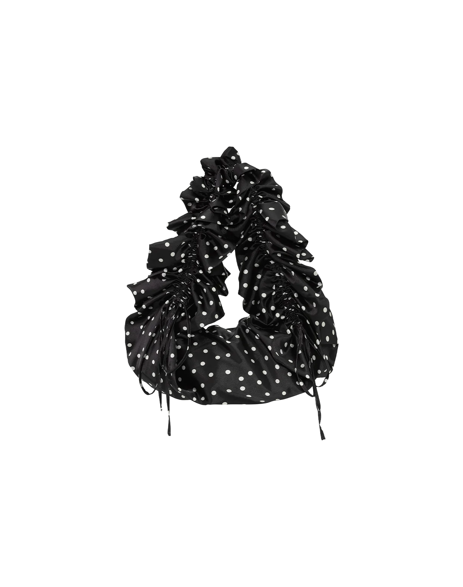 Die auffällige Shirley Bag ist aus 100 % recyceltem Polyester gefertigt und zeigt ein schwarzes Design mit weißen Punkten. Der verstellbare Träger und die Rüschen-Details verleihen ihr einen verspielten Charakter. Vielseitig tragbar – über der Schulter, crossbody oder als Handtasche.