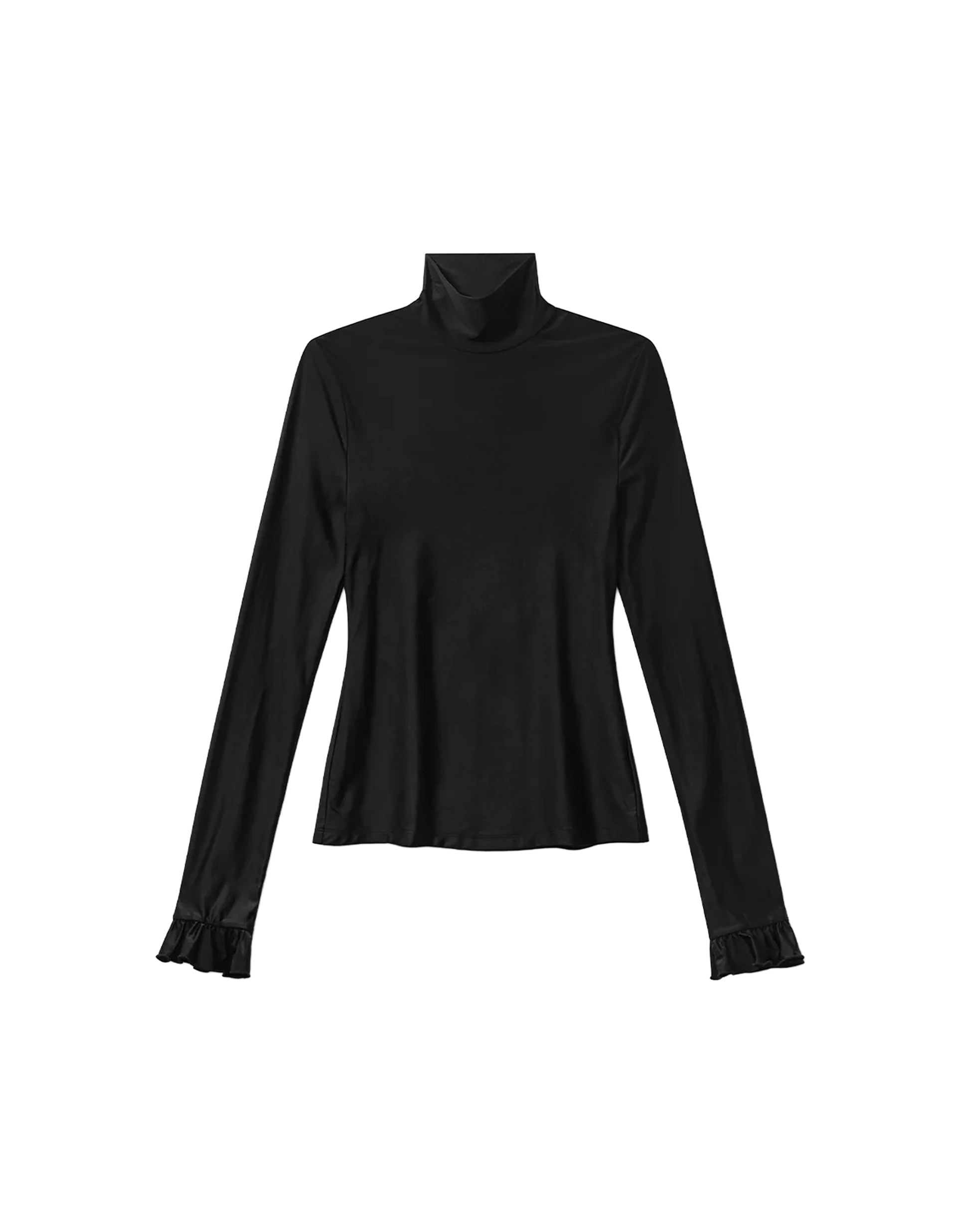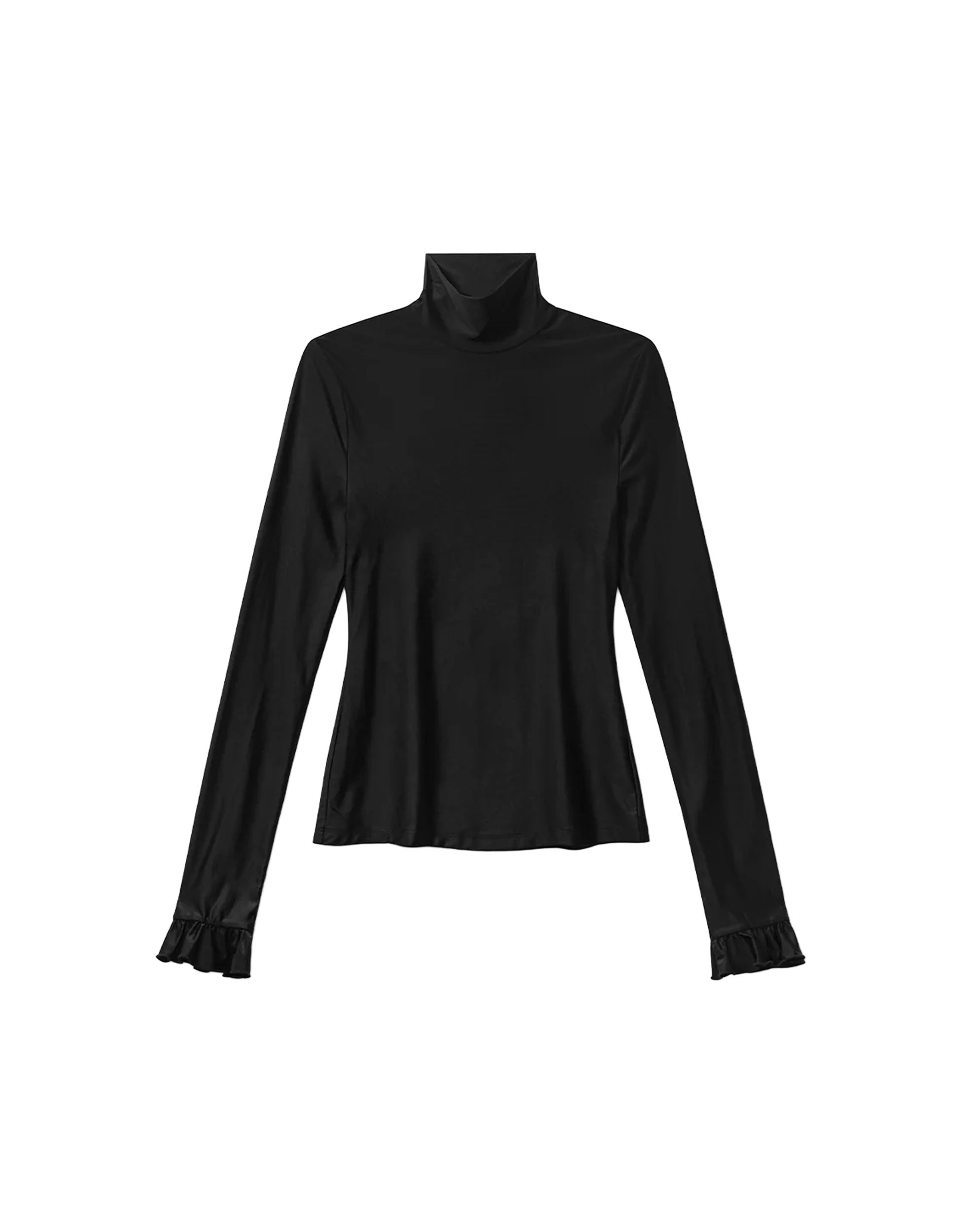 Das Sol Top besteht aus 75 % recyceltem Nylon und 25 % Elasthan. Mit seiner figurbetonten Silhouette, dem hohen Kragen und den langen Ärmeln verkörpert es schlichte Eleganz. Feine Rüschenabschlüsse an den Ärmeln setzen einen femininen Akzent.