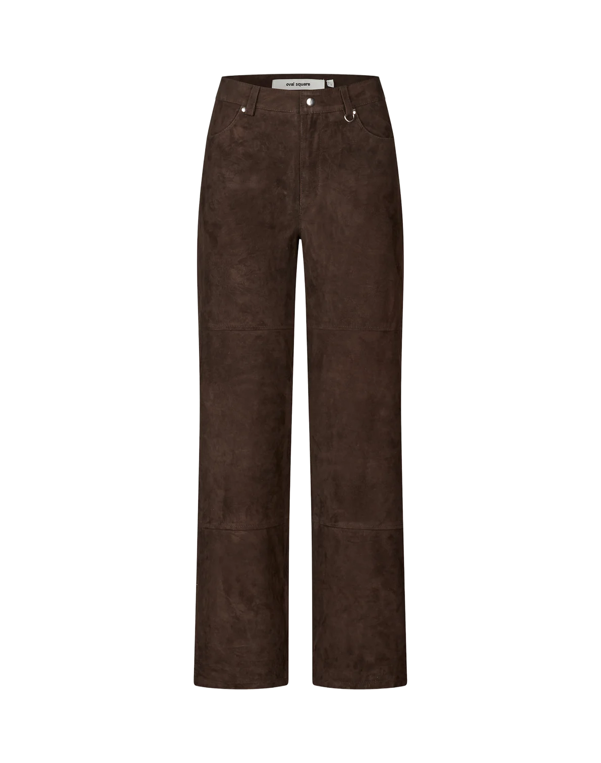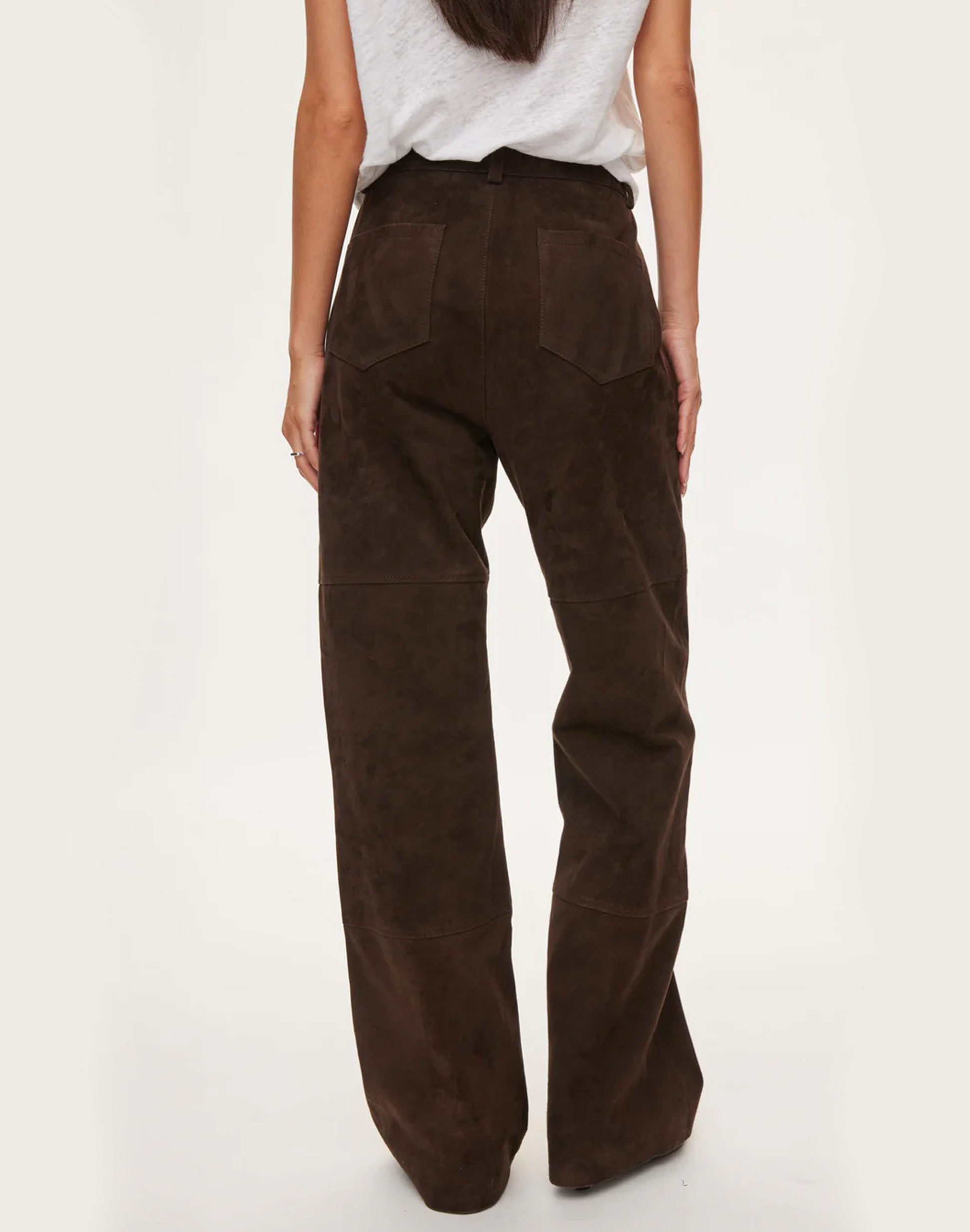 Suede Straight-Leg Hose aus weichem, glattem Wildleder gefertigt mit tonal abgesteppten Nähten. Mit verstecktem Reißverschluss und Druckknopf in der Taille. Zwei Fronttaschen und zwei Aufgesetzte Taschen hinten. Silbernes Knopf- und Keilverstärkungen. Reguäre Taille und gerade Beinweite.