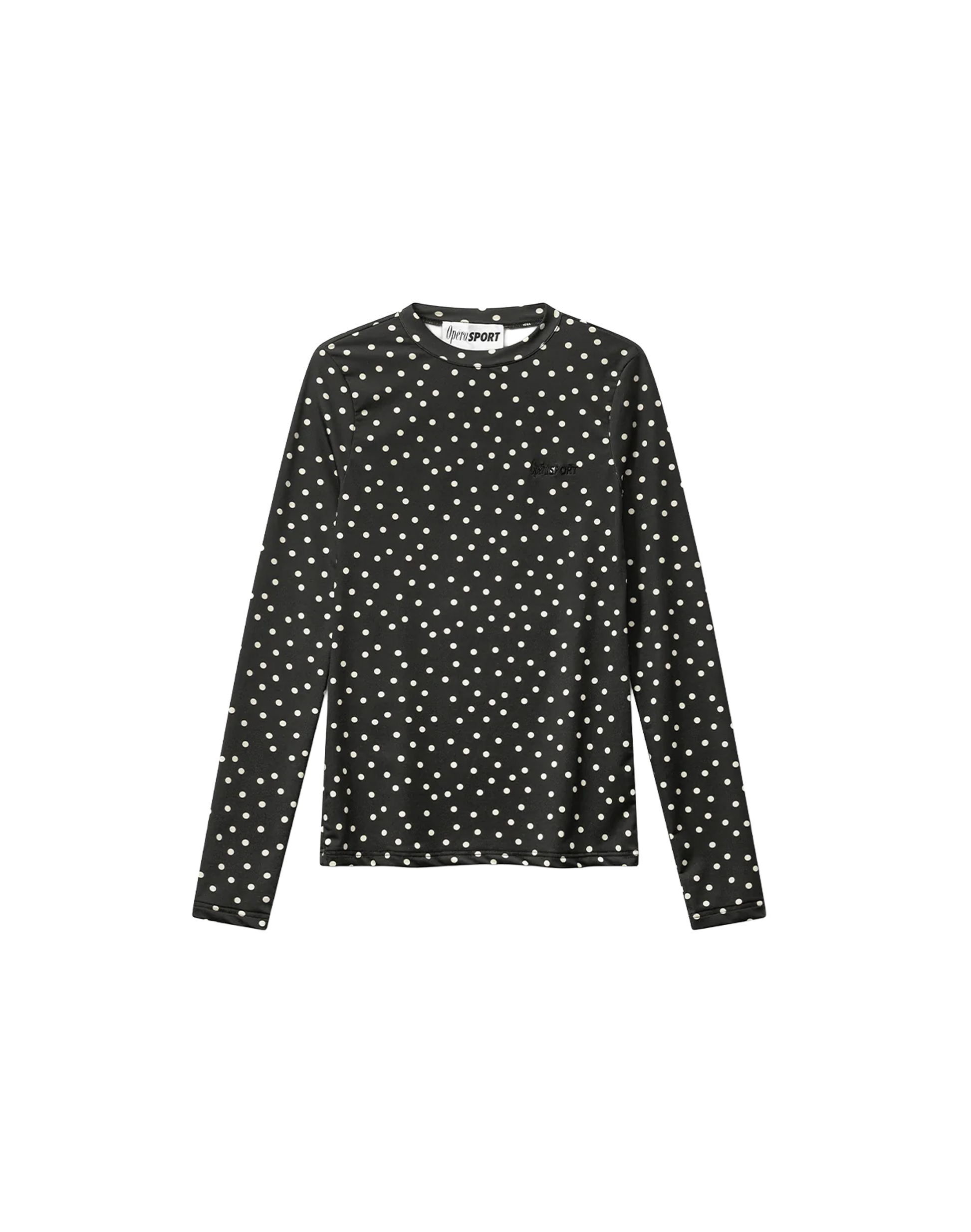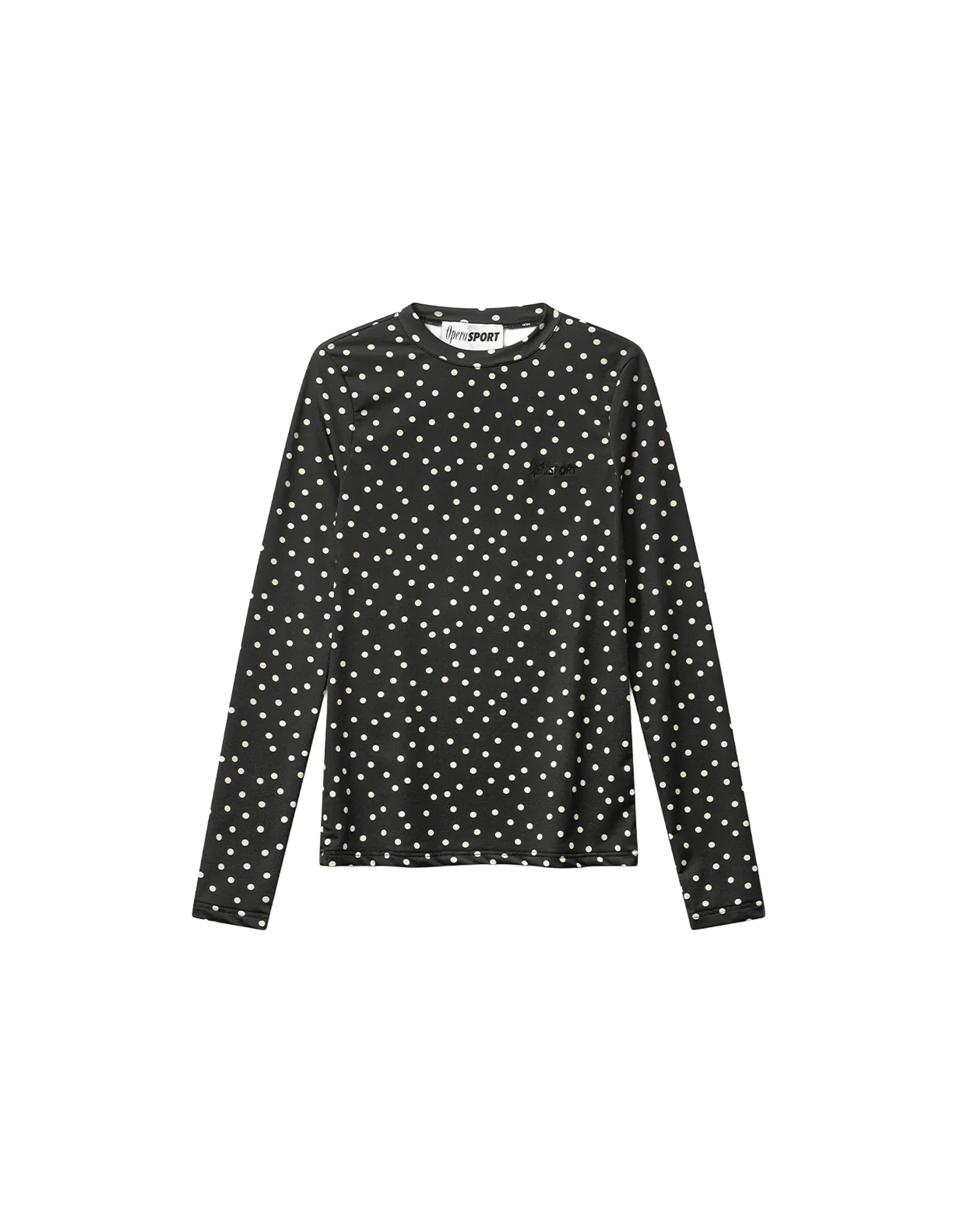 Das Suni Top im weißen Dots Print besteht aus 82 % recyceltem Polyamid und 18 % Elasthan. Mit seinem figurbetonten Schnitt, hohem Kragen und dem charakteristischen OpéraSPORT-Logo auf der Brust ist es vielseitig kombinierbar – solo getragen oder unter Jacken und Kleidern gelayert.